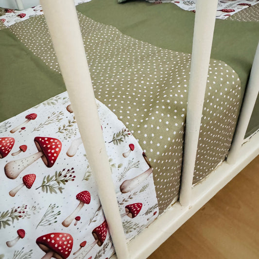 Prête à partir, Couverture de style courtepointe légèrement matelassée, Champignons. Endos doux en minky vert olive