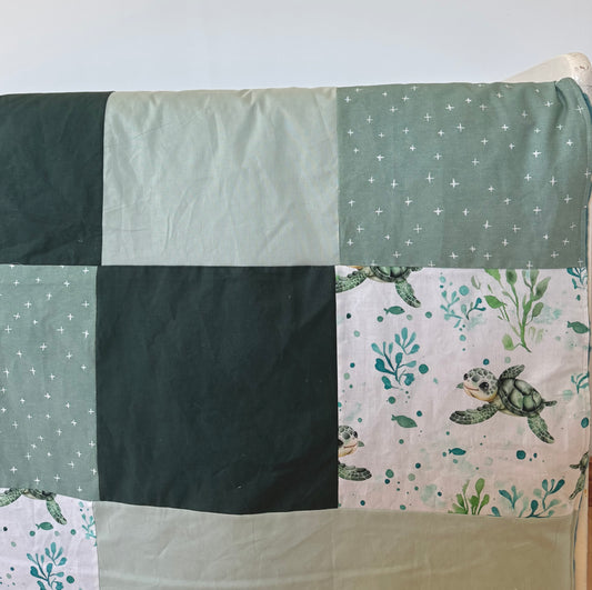 Prête à partir, Couverture de style courtepointe légèrement matelassée, tortues. Endos doux en minky émeraude