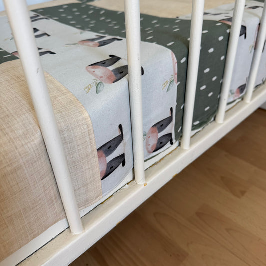 Prête à partir, Couverture de style courtepointe légèrement matelassée, vaches noires et blanches. Endos doux en minky vert olive