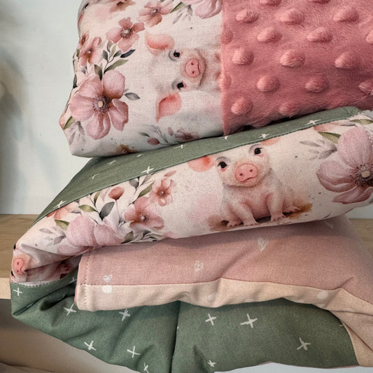 Prête à partir, Couverture de style courtepointe légèrement matelassée, Cochons roses. Endos doux en minky rose