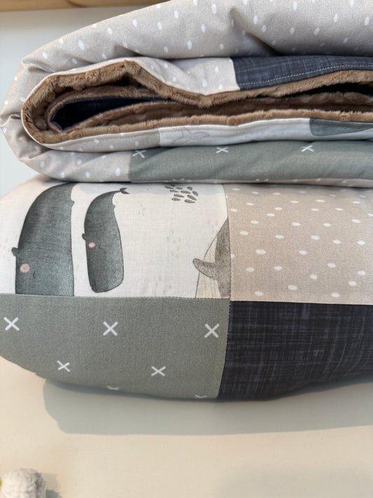 Prête à partir, Couverture de style courtepointe légèrement matelassée, familles de baleines. Endos doux en minky taupe