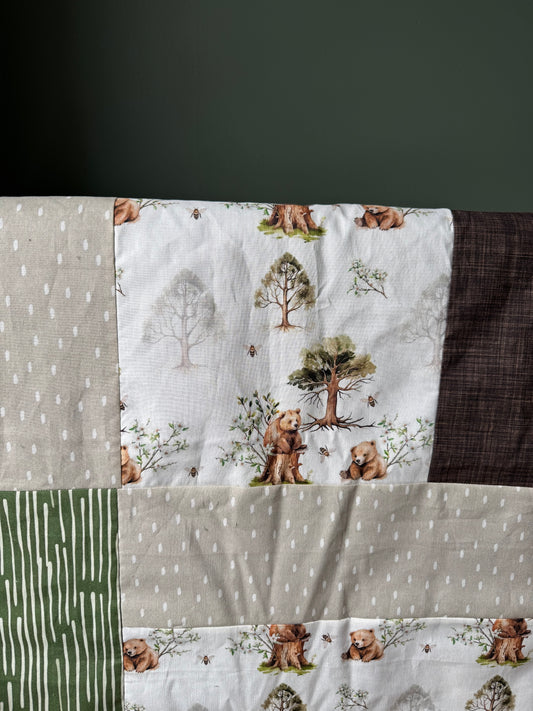 Prête à partir, Couverture de style courtepointe légèrement matelassée, Oursons et arbres. Endos doux en minky vert
