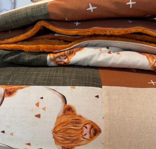 Prête à partir, Couverture de style courtepointe légèrement matelassée, vaches highland. Endos doux en minky orange