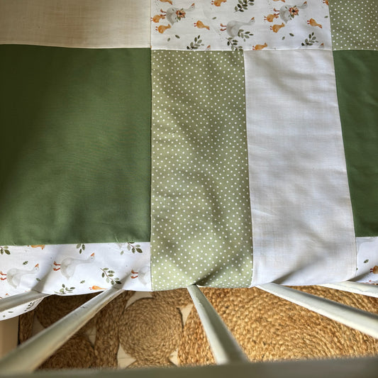 Prête à partir, Couverture de style courtepointe légèrement matelassée, Animaux de la forêt vert et beige. Endos doux en minky vert