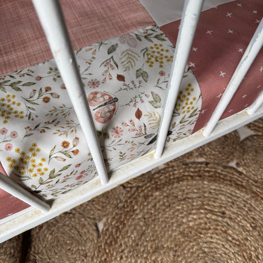 Prête à partir, Couverture de style courtepointe légèrement matelassée, cerfs fleuri rose et jaune. Endos doux en minky ivoire