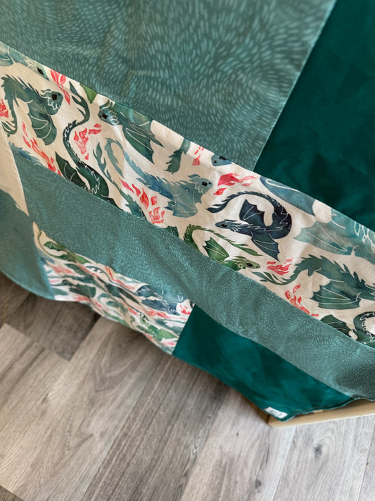 SOLDE Prête à partir , Couverture de style courtepointe Dragons, endos minky émeraude, dernière disponible