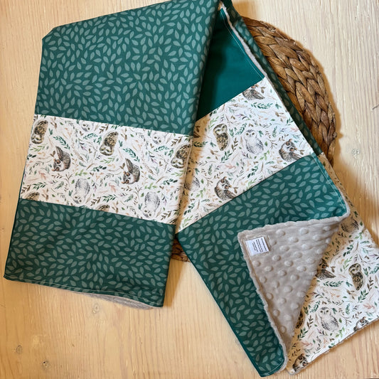 SOLDE, Prête à partir, Couverture de style courtepointe petits hiboux turquoise Endos doux en minky gris