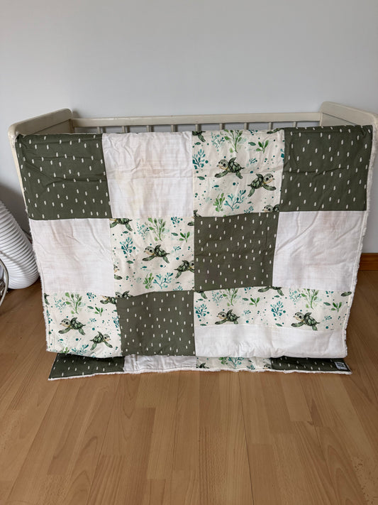 SOLDE Prête à partir ! Couverture de style courtepointe Tortues. Endos fourrure ivoire (taché)