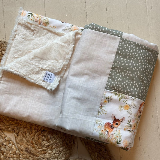 SOLDE, Prête à partir ! Couverture de style courtepointe cerfs fleuri jaune endos fourrure ivoire