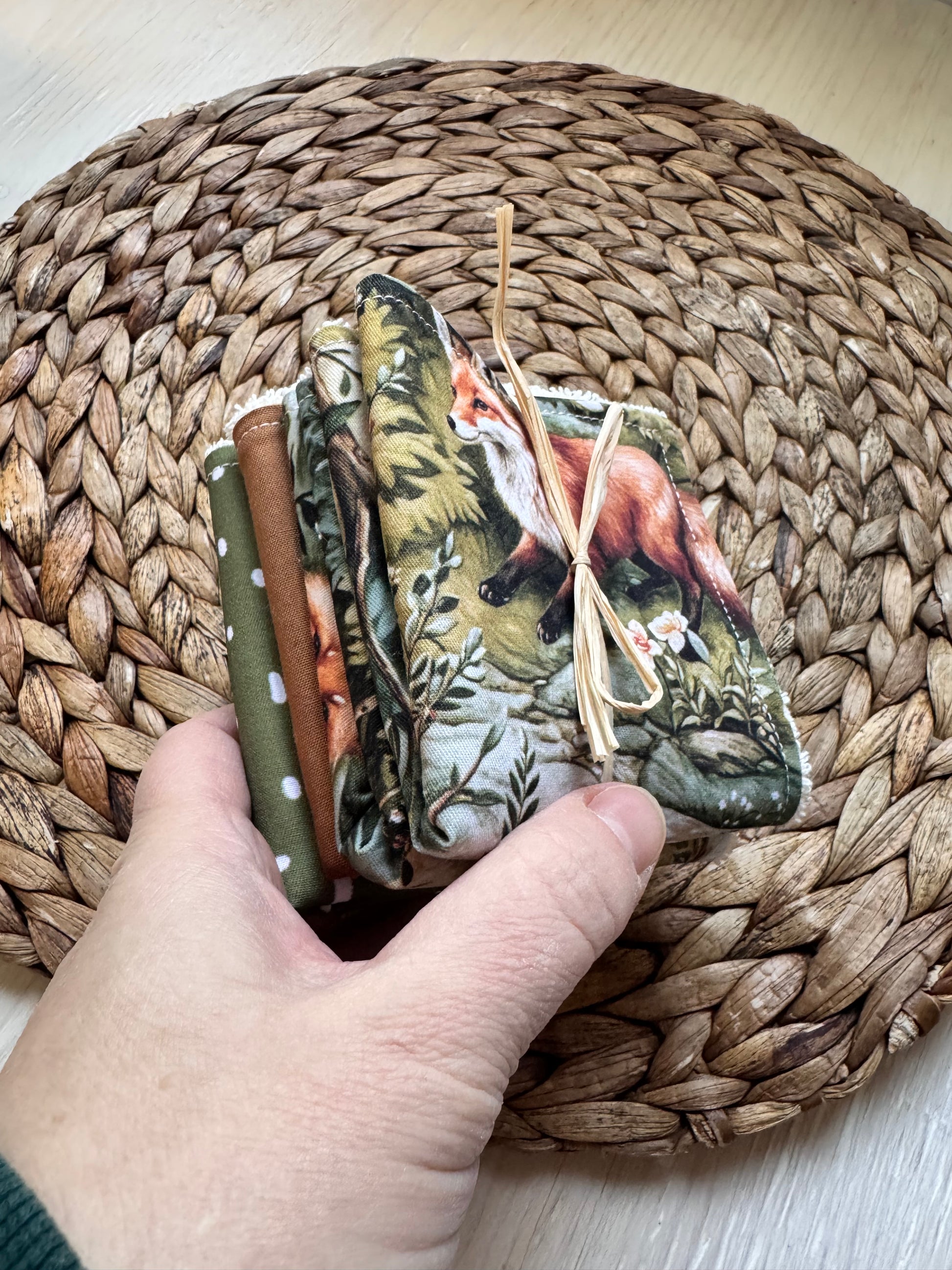 Set of 4 washcloths, one side cotton and one side soft terry cloth. Machine washable and dryable. Comes in a set of 4, quantities may vary depending on availability. These washcloths are made from scraps or leftover fabric, so we cannot guarantee the exact colors you will receive. Thank you for your understanding. 100% cotton, each measures approximately 8x8 inches.