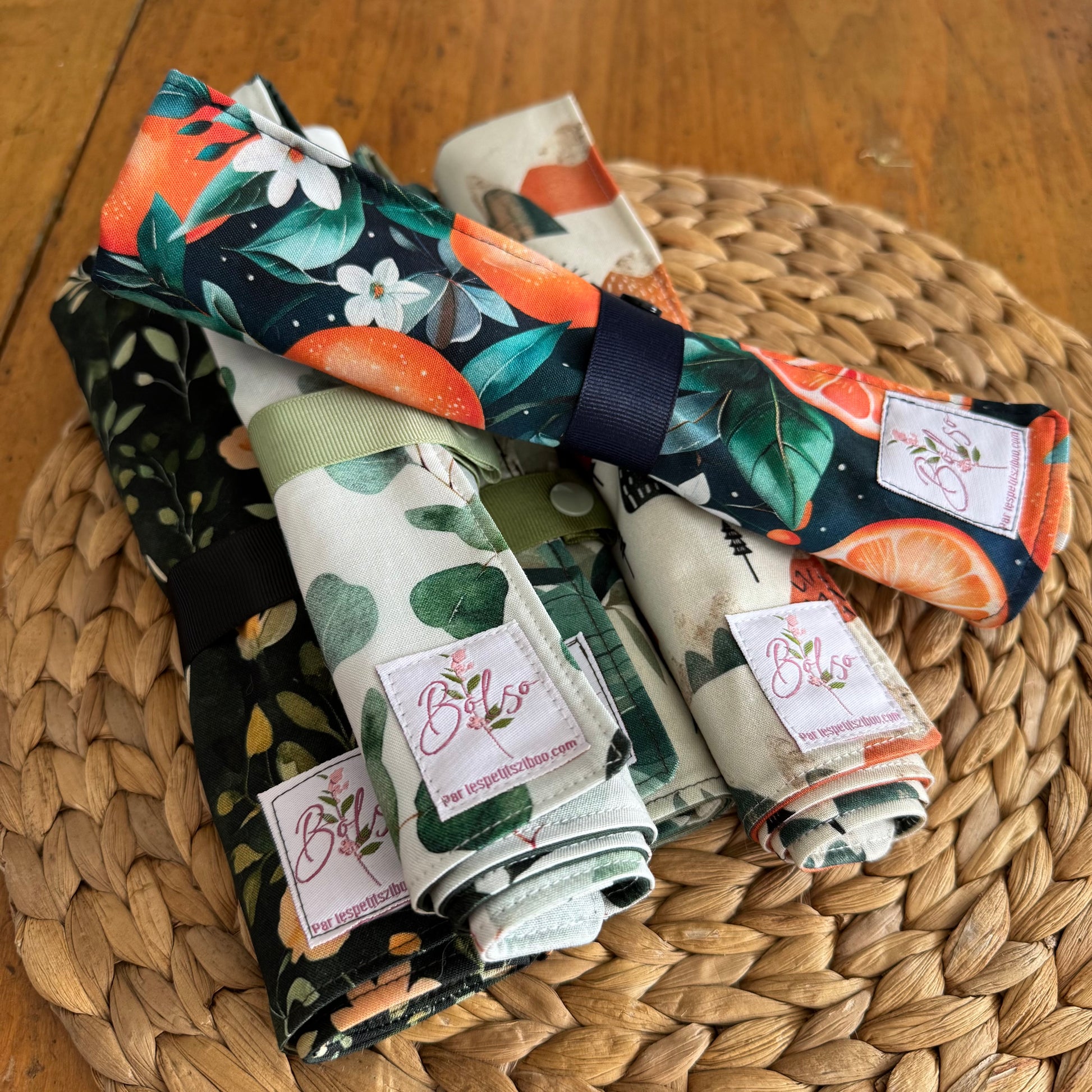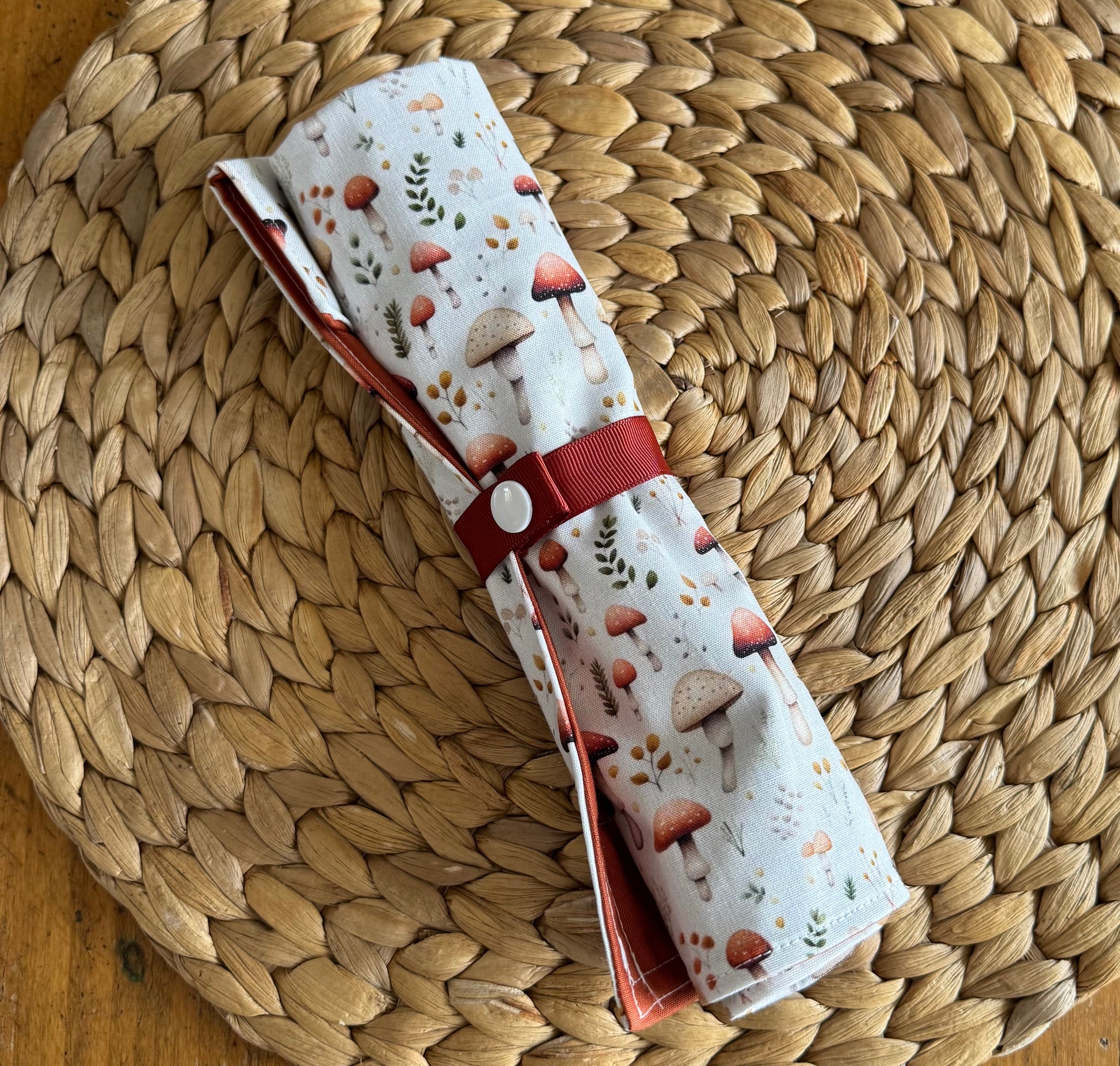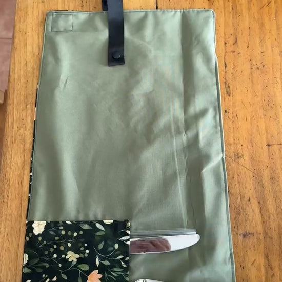 Taille 12x18'' doublé d'un nylon à l'intérieur afin qu'il soit imperméable. Extérieur 100% coton. se roule et s'attache pour faciliter le transport