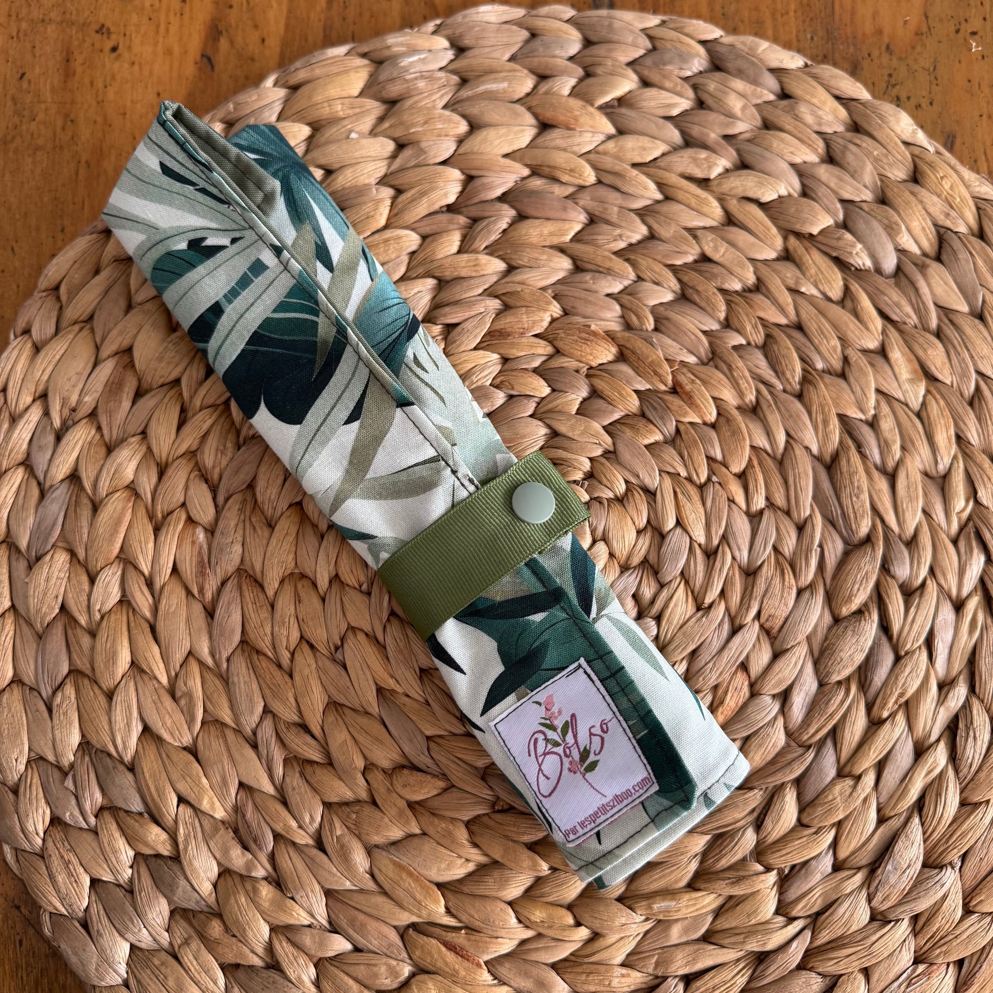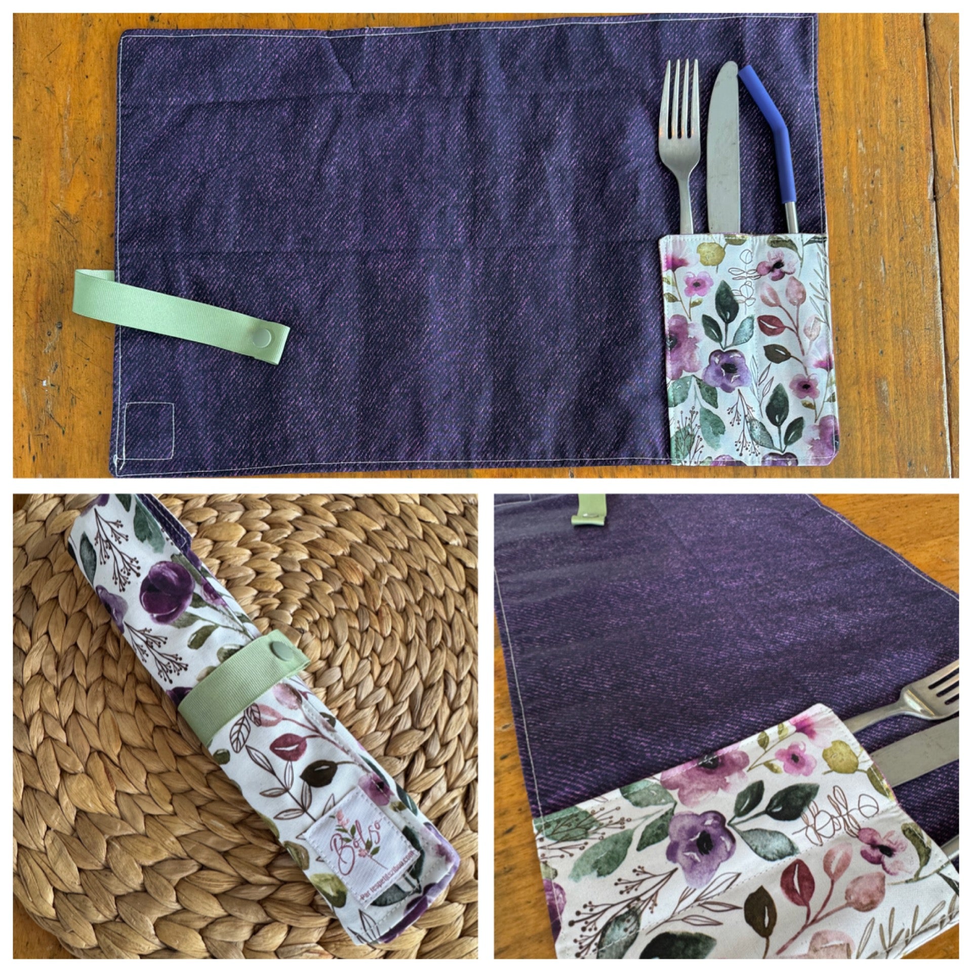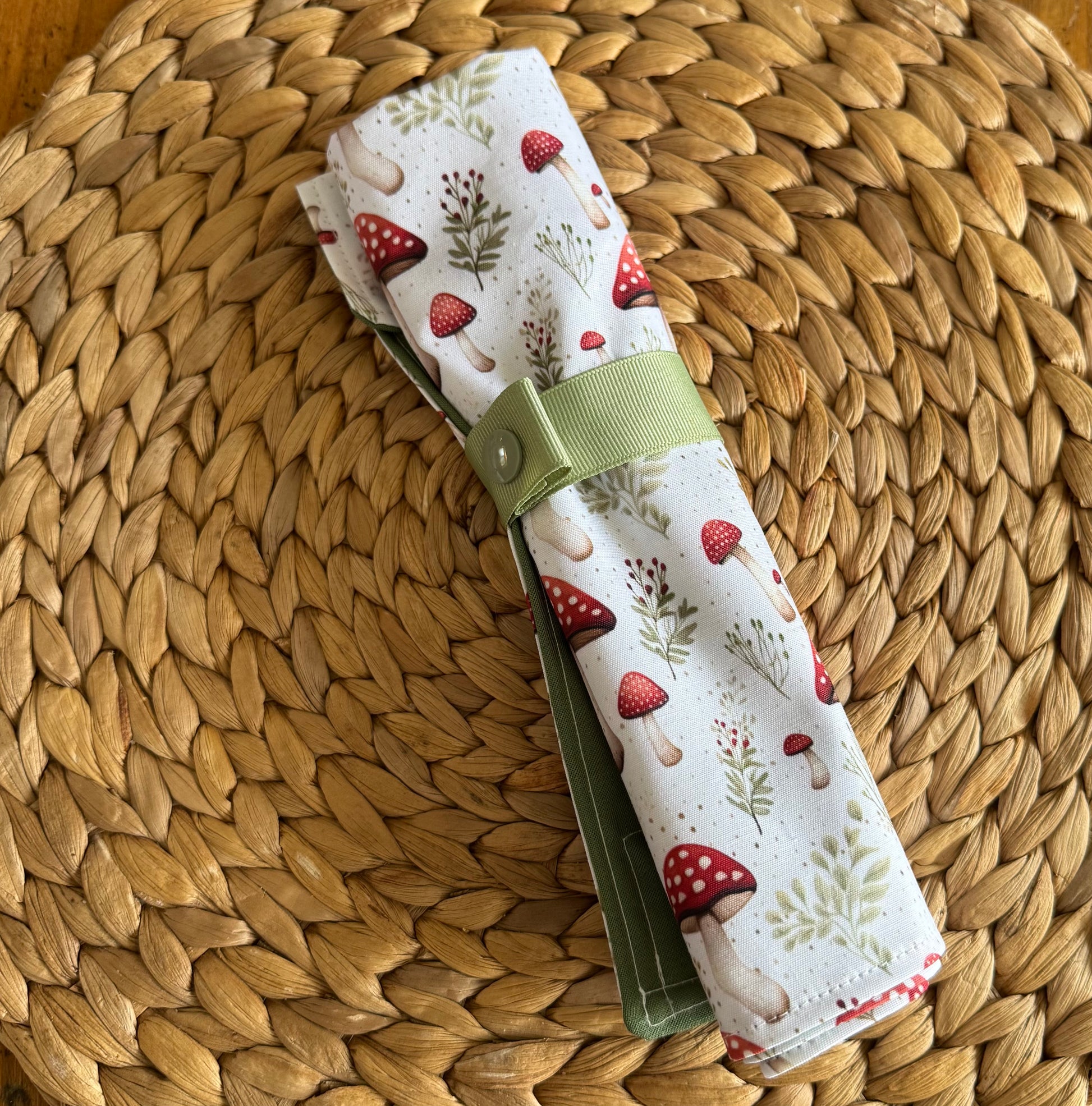 Taille 12x18'' doublé d'un nylon à l'intérieur afin qu'il soit imperméable. Extérieur 100% coton. se roule et s'attache pour faciliter le transport