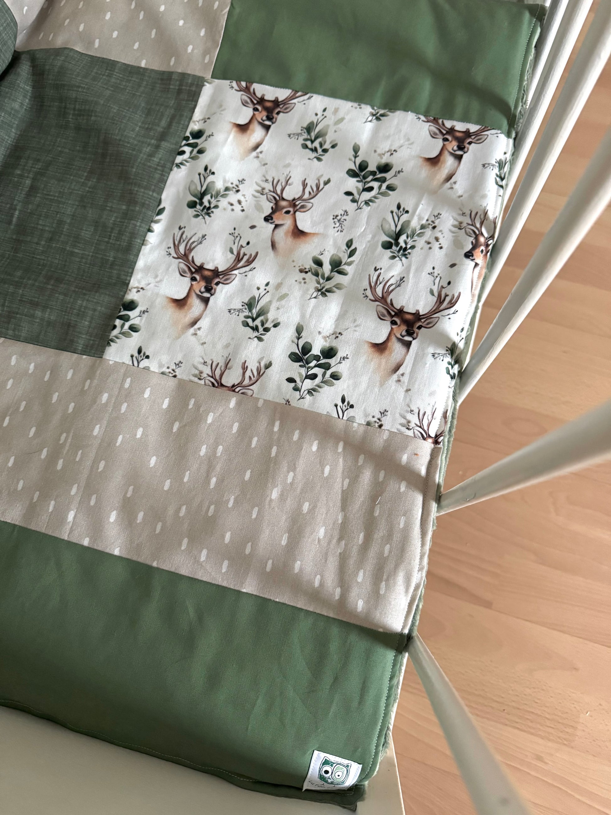 Prête à partir, Couverture de style courtepointe légèrement matelassée, cerfs et branches. Endos doux en minky vert olive